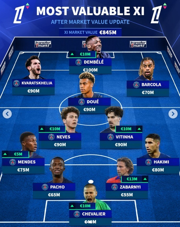 10月11日讯 德转更新了法甲球员身价,并盘点了目前身价最高的11人阵容,巴黎球员包揽,具体如下: