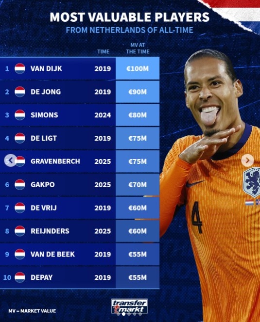 荷兰球员历史身价榜:范迪克1亿欧居首,弗兰基-德容9000万欧次之